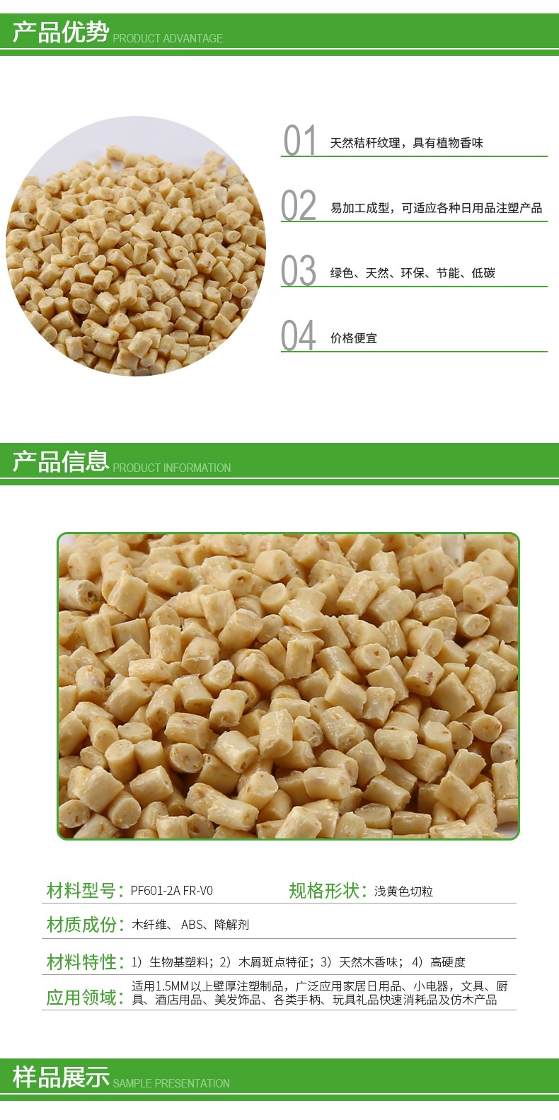 材料特性:1)生物基塑料;2)木屑斑點(diǎn)特征;3)天然木香味;4)高硬度